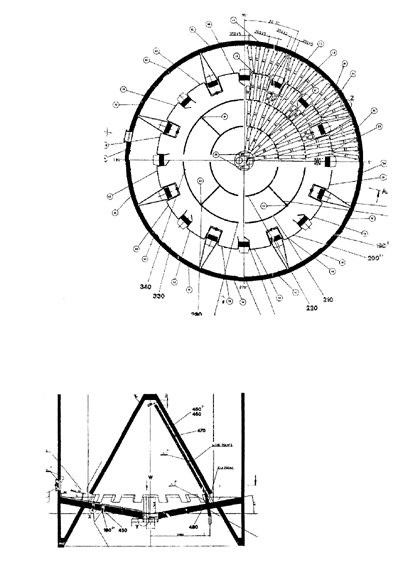 CP生料均化庫是南通江森機(jī)械制造有限公司引進(jìn)德國BMH公司一種新型生料均化庫,其特點(diǎn)是電耗低,均化效果好。CP生料均化庫的均化原理是庫頂生料通過8條斜槽均勻布料,不同時(shí)期的生料在庫內(nèi)呈橫向分布,庫底充氣系統(tǒng)設(shè)計(jì)更符合生料充氣后的流動(dòng)性,呈放射狀斜向分布,環(huán)形區(qū)一般分8個(gè)區(qū),每隔5分鐘輪流充氣,充氣區(qū)生料因松動(dòng)及氣流的引導(dǎo)卸入中心區(qū),庫內(nèi)不同層的生料豎向切割下料實(shí)現(xiàn)生料的均化,不同時(shí)間的生料進(jìn)入中心區(qū)后再進(jìn)行氣體強(qiáng)烈混合均化,從而達(dá)到理想的均化效果。