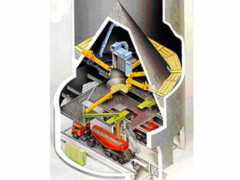 連續(xù)式均化庫是生料從庫頂連續(xù)進(jìn)料,經(jīng)過充氣攪拌的同時連續(xù)出料,庫在中心位置設(shè)一個圓柱形混合室,以降低庫內(nèi)卸料壓力,消除漏..